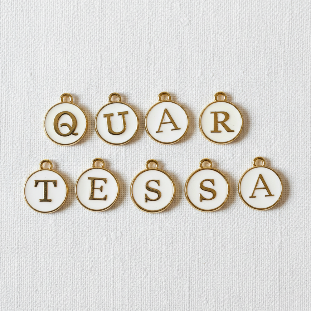 Charm redondo con letra en relieve y borde dorado. Sencillo, elegante y perfecto para personalizar tu cadena con una inicial.
