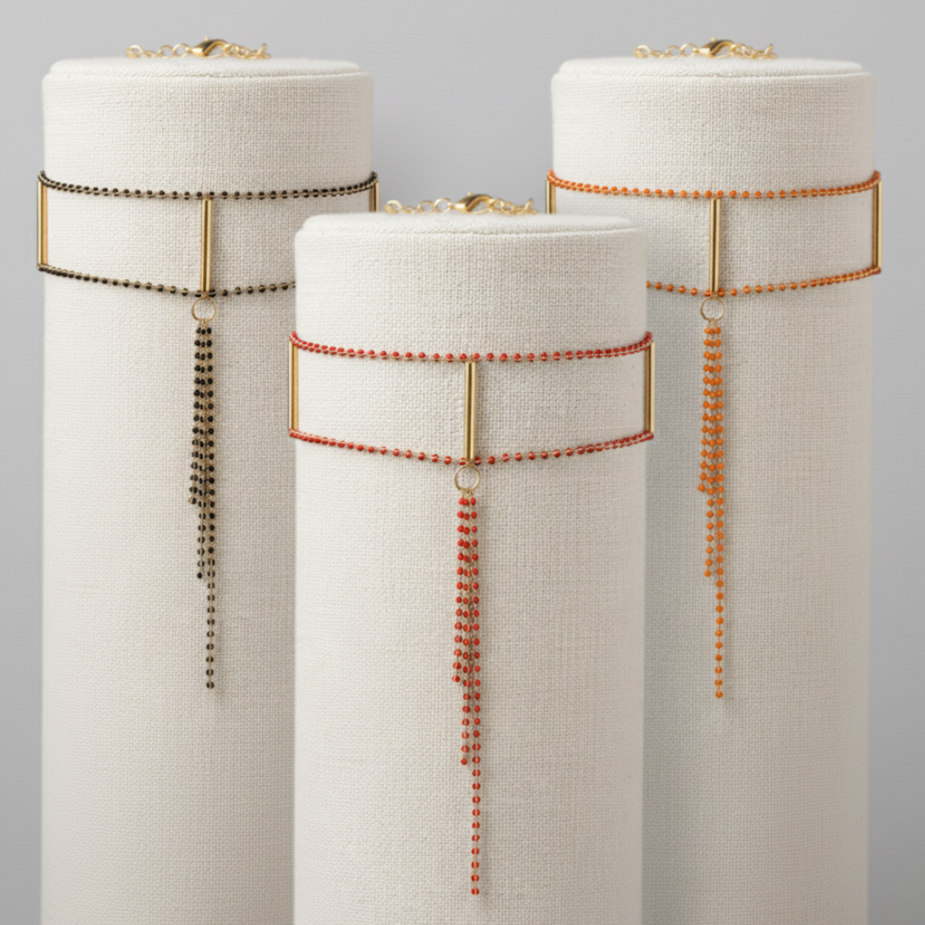 No hay medias tintas aquí. Cuentas rojas, negras o naranjas (preguntar disponibilidad) en el centro y tres cadenas cayendo al pecho, porque un buen collar no tiene que ser discreto. Es de esos que te pones y piensas "vale, ahora sí".
