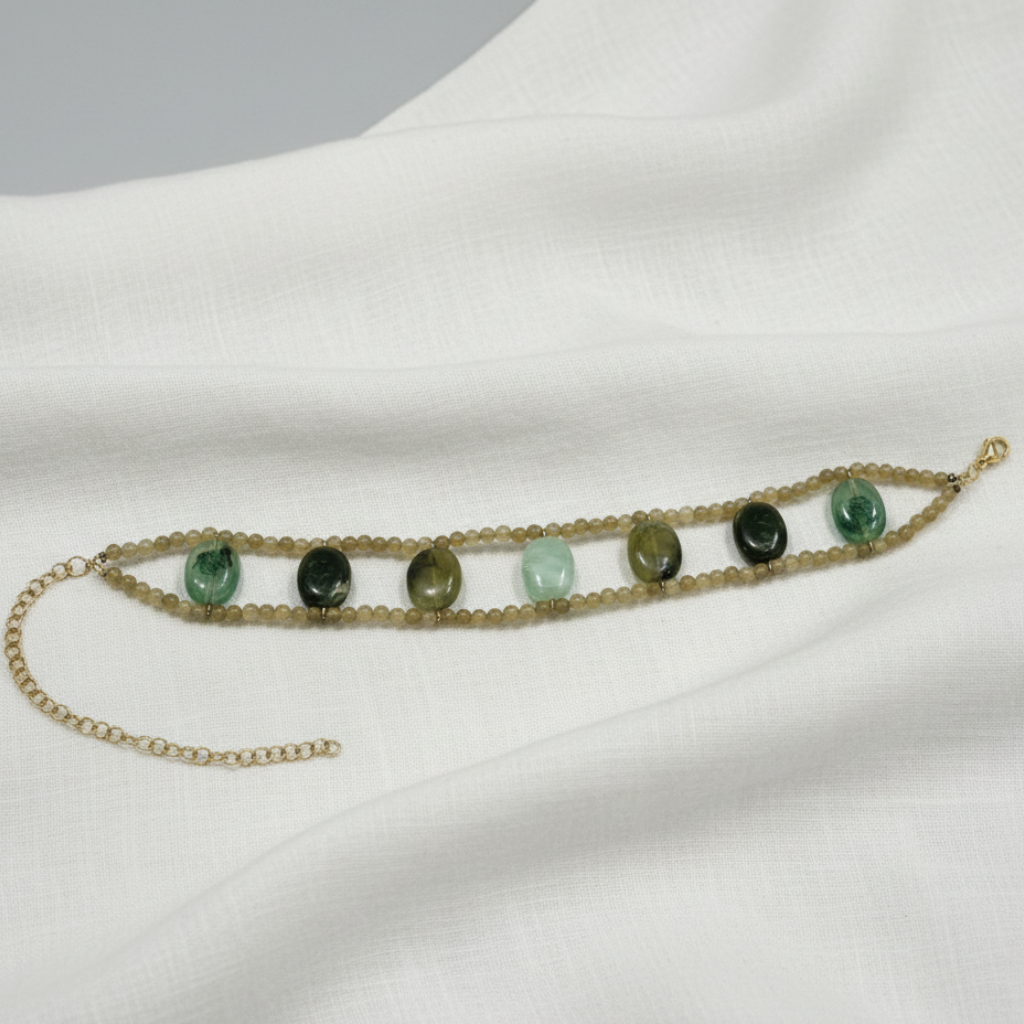 Detalles: personalización total del color y del ritmo de las cuentas para que construyamos juntas la combinación perfecta. Cada pieza se diseña y monta de forma artesanal, pieza a pieza, revisando tensión, resistencia y acabado antes de salir del taller. Las partes personalizables son ligeras, suaves al tacto y con presencia; única por naturaleza y porque la hacemos especialmente para ti.