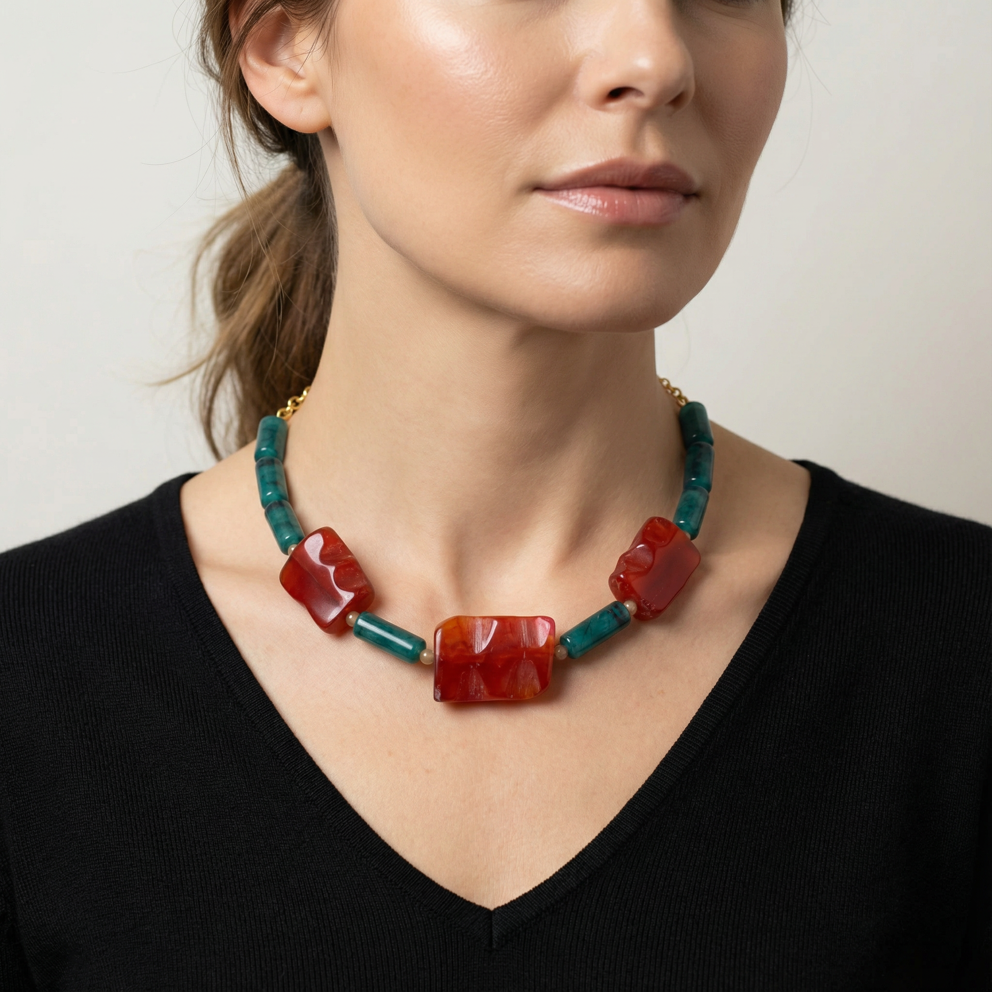 Tres ágatas grandes en el centro y alargadas a los lados. No es un collar, es EL collar. Lo típico que te pones sin pensar y terminas llevándolo cada día. No necesita permiso ni presentación.