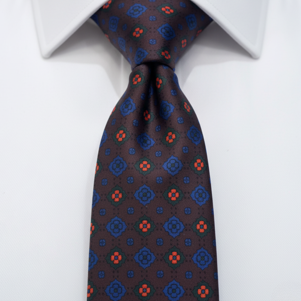 Si alguna vez has visto flores de noche bajo la luna, sabrás de qué va esta corbata. Los detalles en azul sobre el fondo oscuro le dan un toque fresco pero sin ser demasiado llamativo. Es como tener un jardín discreto en tu look, perfecto para el día a día o para cualquier evento donde quieras sentirte cómodo pero elegante.