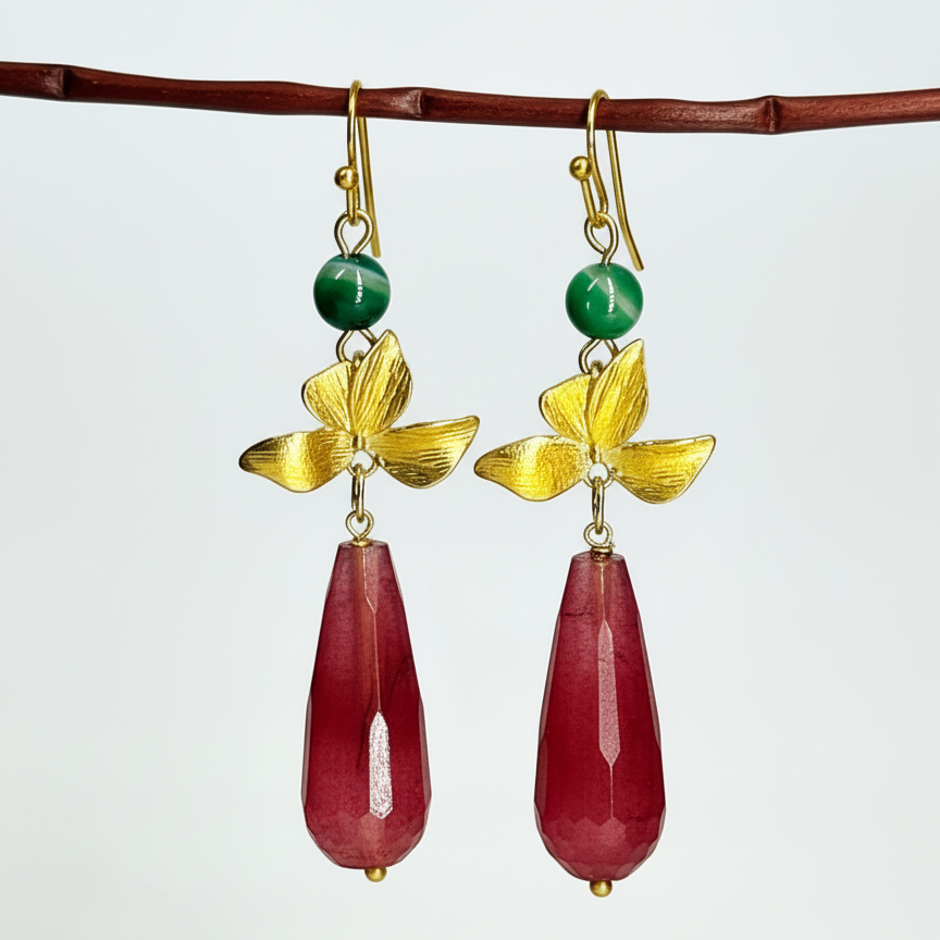 Los pendientes Castañuelas son el complemento ideal para la Feria de Abril. Con su bola de color vibrante, hoja dorada reluciente y la lagrima de ágata, capturan la esencia festiva y la elegancia andaluza en un solo accesorio. Perfectos para bailar bajo las luces de la feria y destacar con estilo en cada paso.