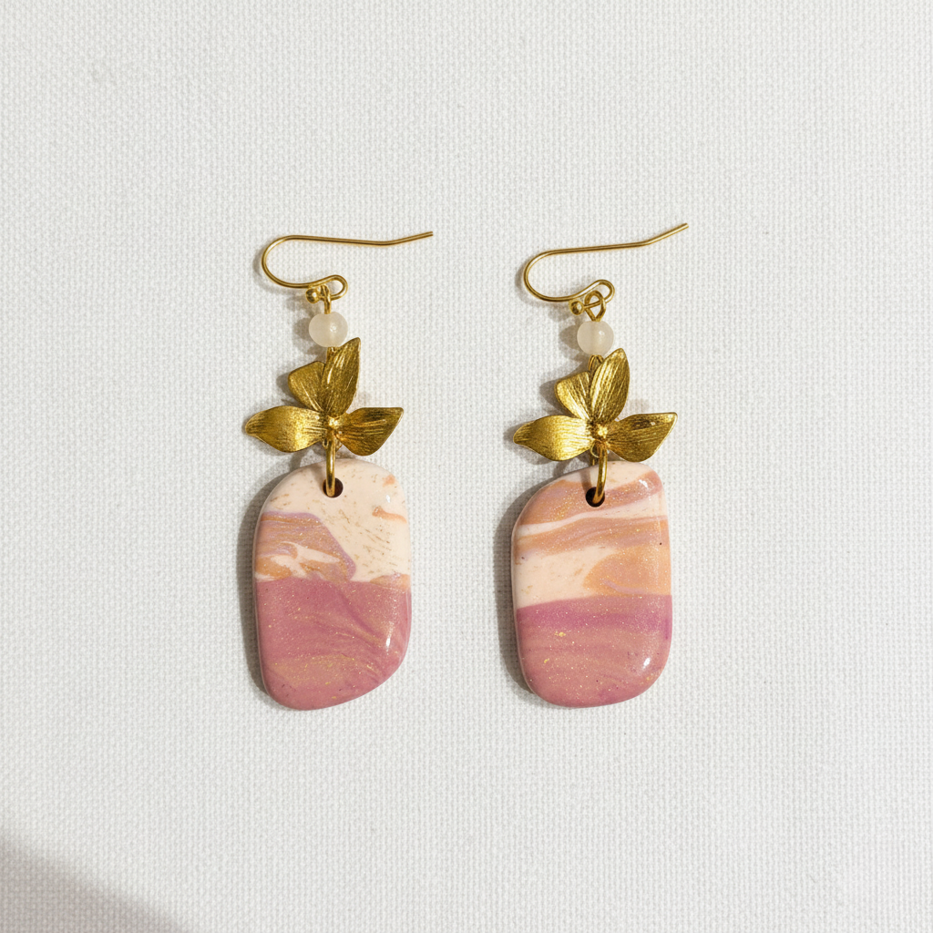 ¡Unidades Limitadas! Tiene ese punto dulce… pero con carácter. La arcilla polimérica se mezcla a mano y crea un juego de rosas y blancos que queda impecable. El toque dorado arriba le da actitud sin recargar. Es de esos pendientes que funcionan siempre: sencillo, diferente y con mucha presencia.