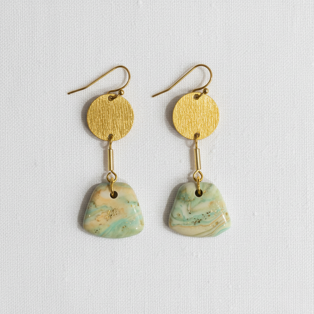 ¡Unidades Limitadas! Arcilla polimérica trabajada a mano en tonos verdes y blancos, con un acabado limpio y potente. La pieza dorada arriba le da el toque justo, y la varilla de cristal aporta movimiento sin exagerar. Un diseño directo, diferente y muy fácil de llevar.
